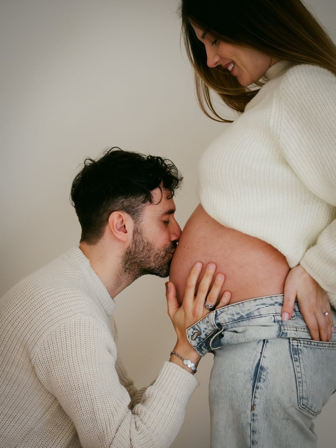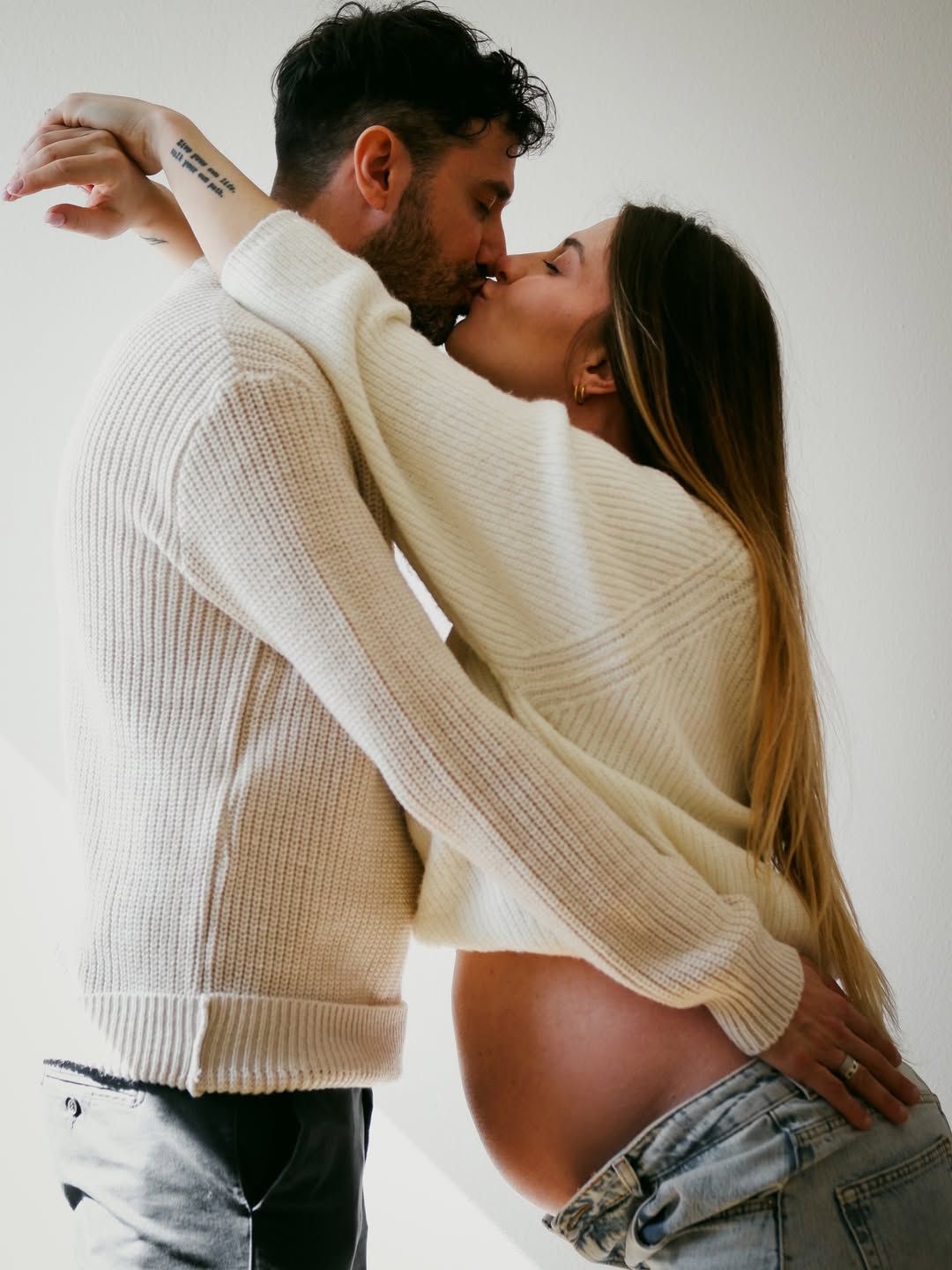 На кадрах Харлан позує у блакитних джинсах і вільному светрі молочного кольору, який делікатно підкреслює її округлий живіт, тоді як Самеле ніжно обіймає кохану.