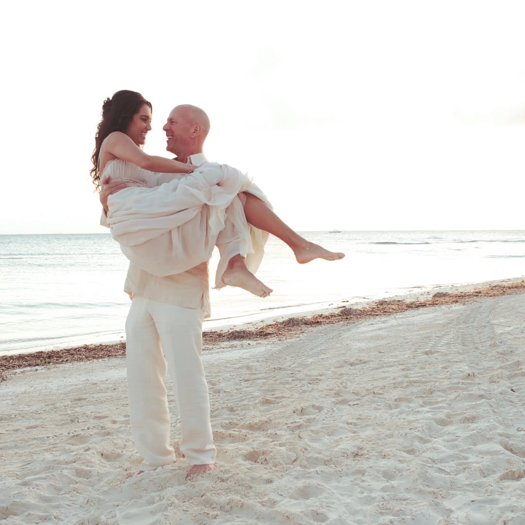 На знімку Брюс та Емма позують на піщаному пляжі у білосніжних нарядах. Актор ніжно тримає наречену на руках. Актор ніжно тримає наречену на руках. Тоді пара ще не знала, як складеться їхнє життя, проте кохання між ними досі залишається міцним і щирим.